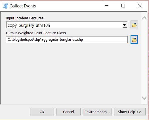 At this moment each point sits on top of another. We need to merge coincident points and make a count of how many were merged at each point. Open the Collect Events tool from Spatial Statistics Tools > Utilities. Set the copy of the burglary layer as the Input Incident Features and set a filepath and name for the Output Weighted Point Feature Class. Run the tool.