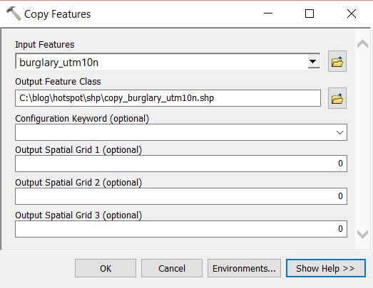 We first need to prepare the data. At the moment each point represent one incident, we need to aggregate the data in some way so that each feature has an attribute with a value in a range. Open the Copy Features tool from Data Management Tools > Features. Create a copy of the burglary point layer. Run the tool and add the new layer to the map.