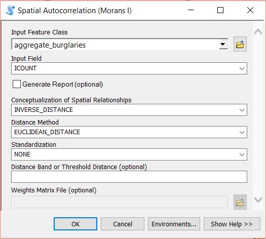 The data will be added to the map with graduated symbols, however, we are interested in running further analysis using Moran’s I. If you open the attribute table for the layer you will see a field has been added called ICOUNT. This field holds the count of cooincident points from the Intergrate layer. Open the Spatial Autocorrelation (Moran’s I) from Spatial Statistics Tools > Analyzing Patterns. Set the aggregated burglary layer as the Input Feature Class and ICOUNT as the Input Field. I have left the default setting for the other parameters (see below).