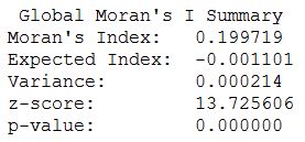 For statistical hypothesis testing, Moran’s I value can be transformed to a z-zcore in which values greater than 1.96 or smaller than -1.96 indicate spatial autocorrelation that is significant at the 5% level.