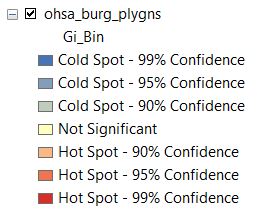 The Gi_Bin field classifies the data into a range from -3 (Cold Spot – 99% Confidence) to 3 (Hot Spot – 99% Confidence), with 0 being non-significant, just take a look at your Table of Contents.