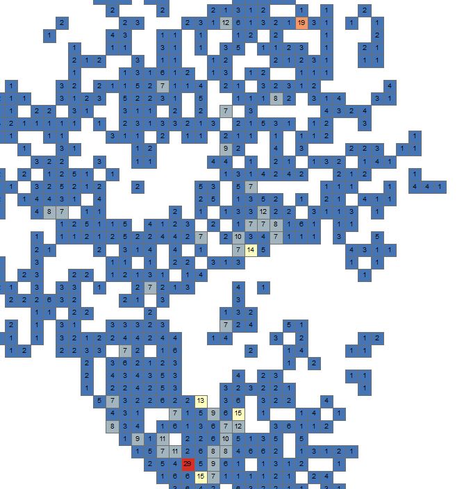 There will be one red cell and one light red cell in the northern half of the map. Use the zoom tool to zoom-in closer to both features. Turn on the labels for the feature for the Join_Count attribute. Notice that the light-red cell has a count of 19 but in the Hotspot Analysis this was a non-significant area. With the second highest burglary count for a 300m x 300m area surely this area requires some attention. Perhaps all areas outside of significant hotspots with values greater that 15 are a priority? I am not a expert in crime analysis so I’ll leave it up to those sleuth’s.