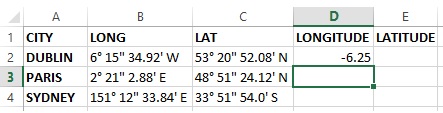 At some point you may be handed data in an Excel file that needs to be imported into a GIS but the coordinate columns are in degrees-minutes-seconds format. For optimum use in the GIS you require the coordinate data in decimal-degrees format. Let’s look at how to achieve this using Excel and the data below for three cities, Dublin, Paris, and Sydney.